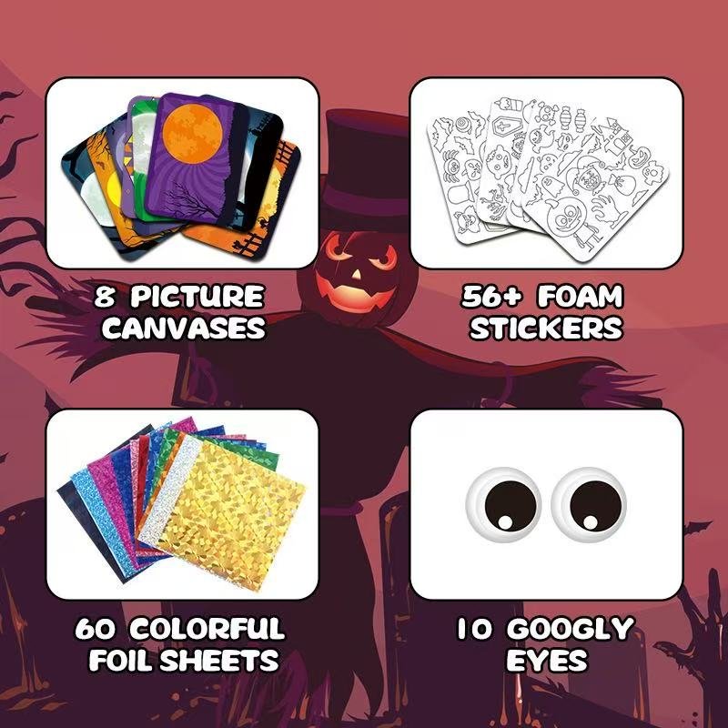 🎨 All-in-One Halloween Craft Kit – Includes 60 colorful foil sheets, 50+ foam stickers, 8 printed backgrounds, and wiggly eyes to bring spooky characters to life.