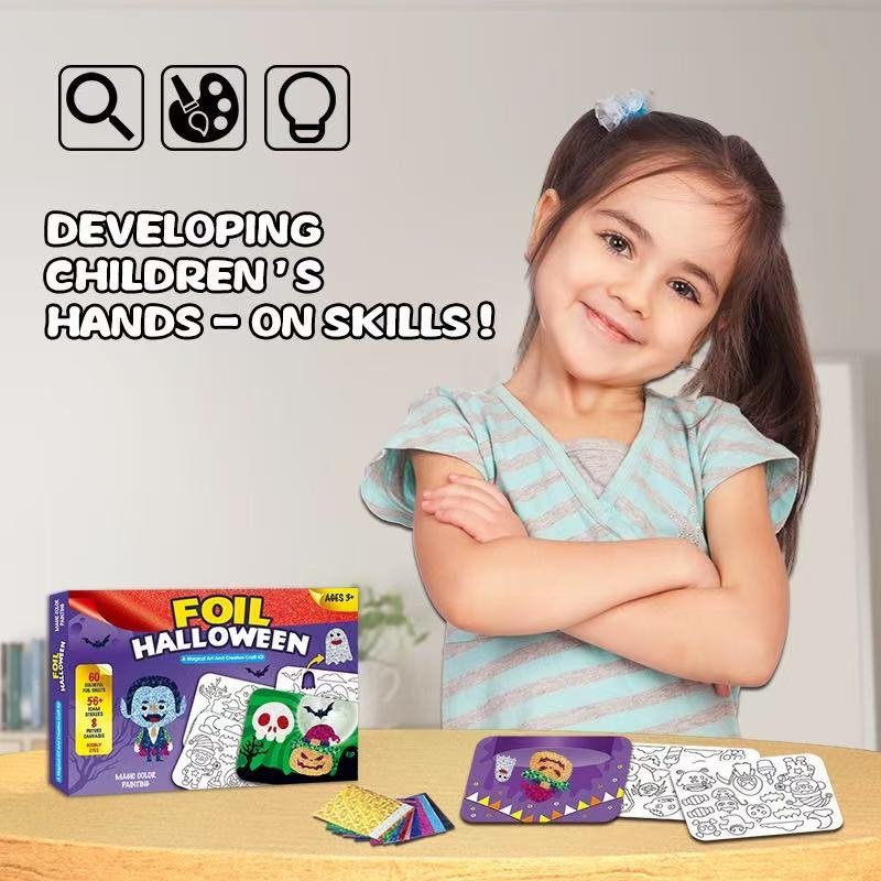 ✨ Mess-Free Magic Foil Painting – Simply peel, stick, and press foil onto stickers to reveal dazzling Halloween art. No glue, no mess – just magical fun!