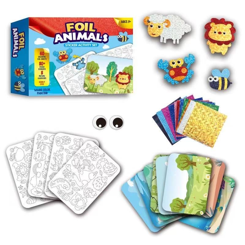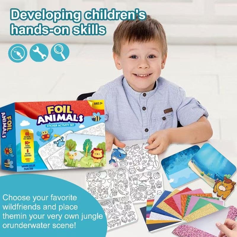 • 🎨 All-Inclusive Craft Kit – Comes with 60 vibrant foil sheets, 80+ foam stickers, background scenes, plastic eyes, and everything your child needs to design their own foil animal world.